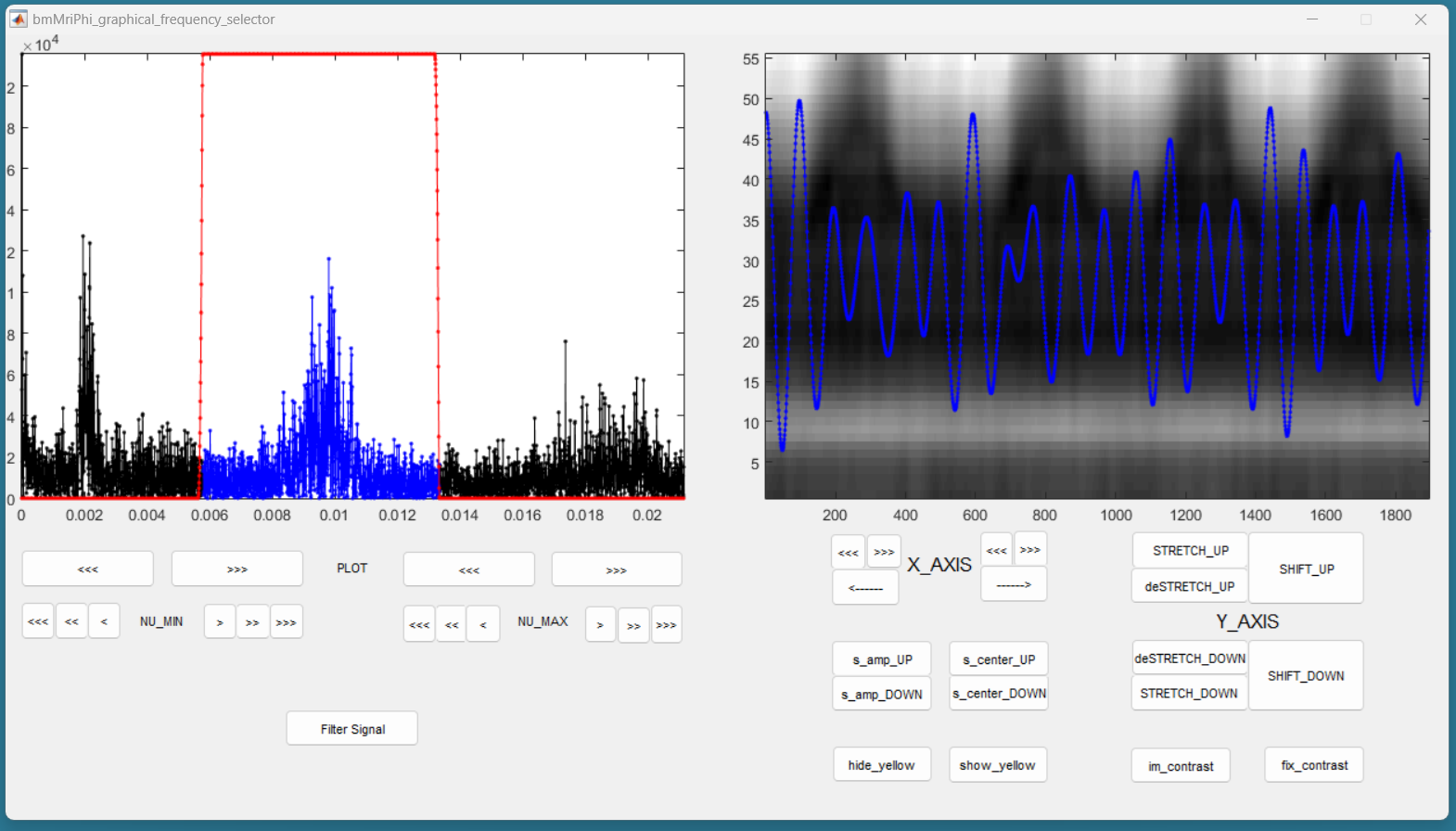 Then press the button “Filter Signal”. The filtered signal appears then in blue on the right panel. You can press “Hide Yelow” to discard the reference signal.